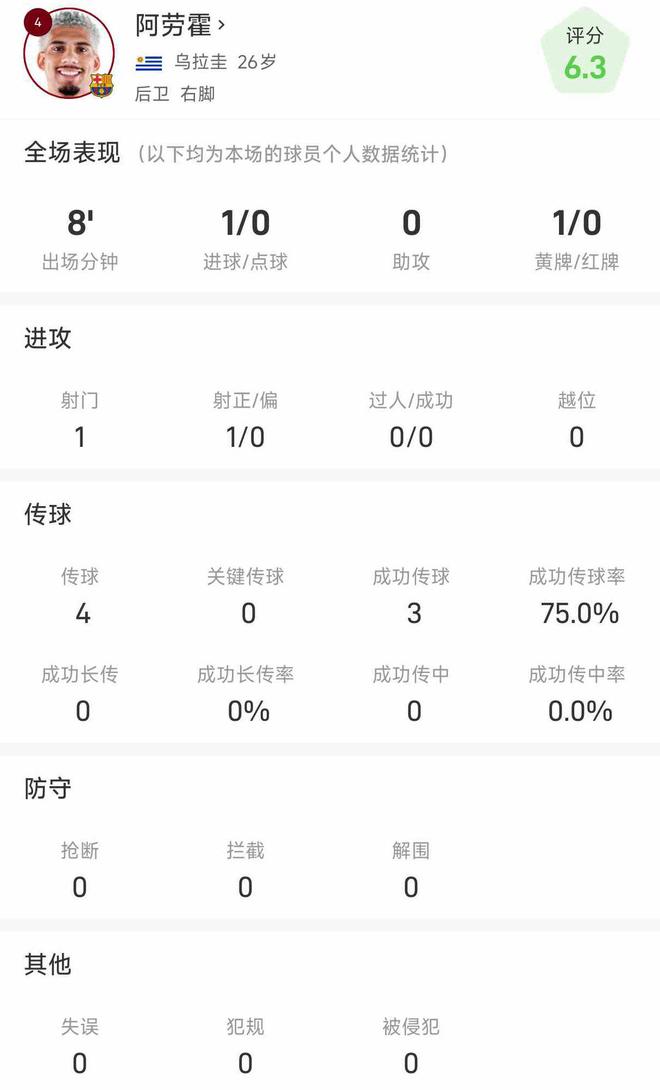統(tǒng)計顯示,阿勞霍本場比賽上場8分鐘,1次射門,打入1球。